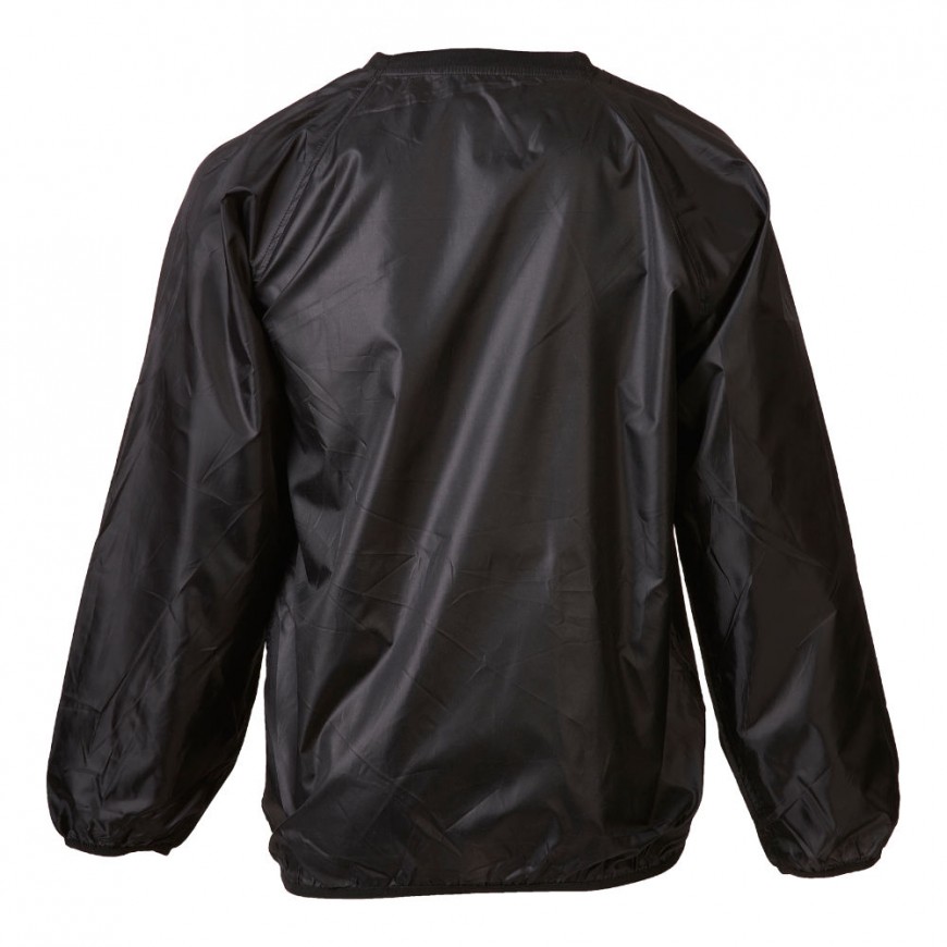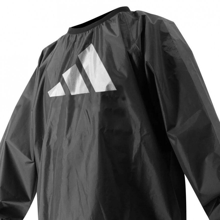 Traje Sauna Adidas (modelo ADISS01), en tejido técnico (nylon o poliéster), compuesto por chaqueta y pantalón con puños y cintura elásticos. Retiene el calor para intensificar la sudoración y favorecer el acondicionamiento físico.